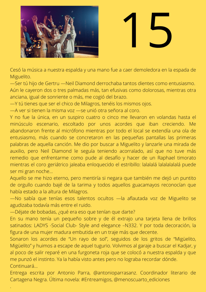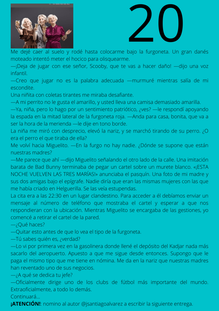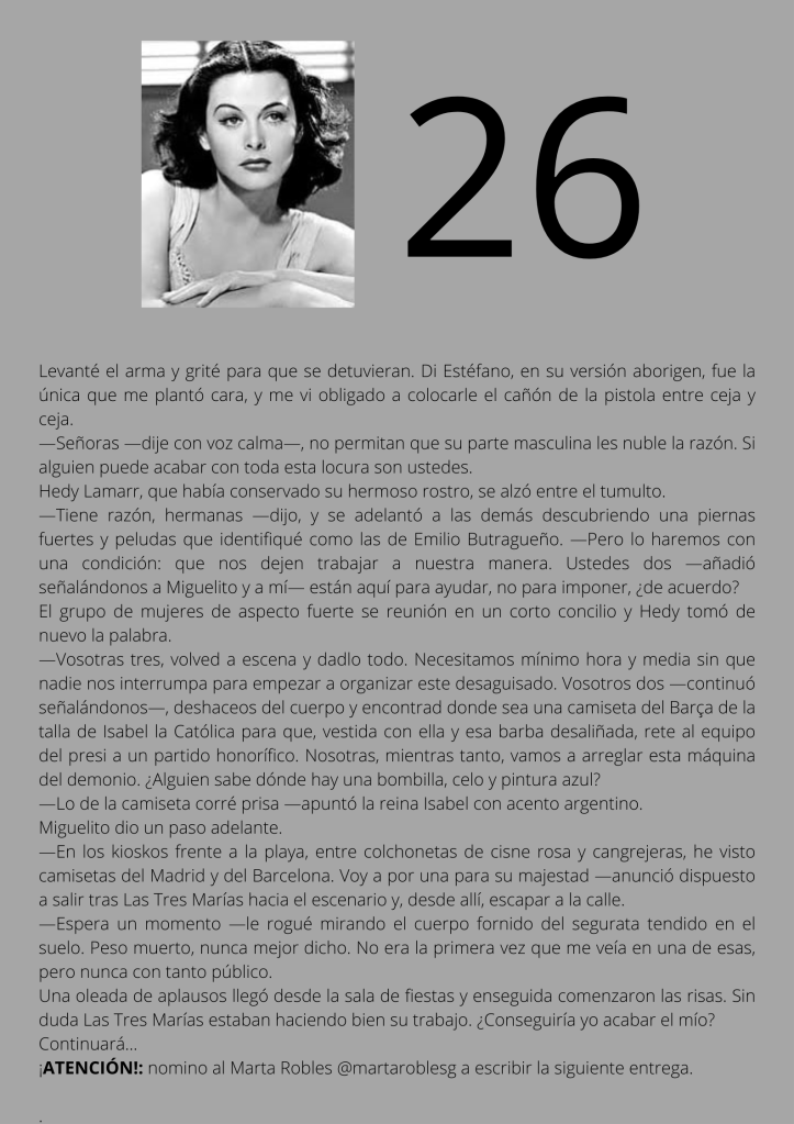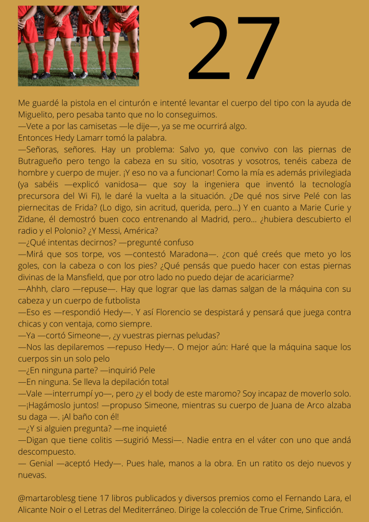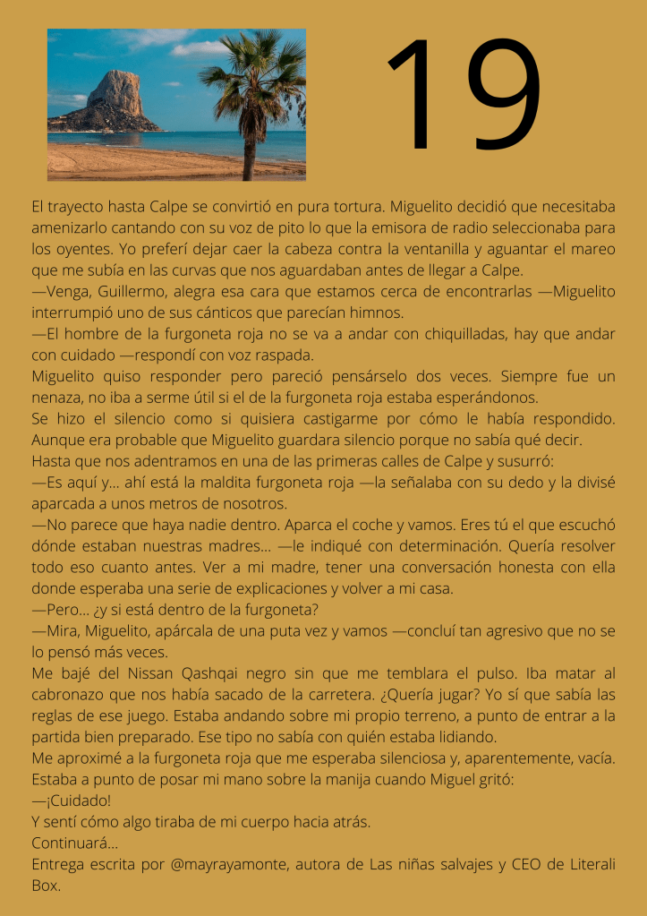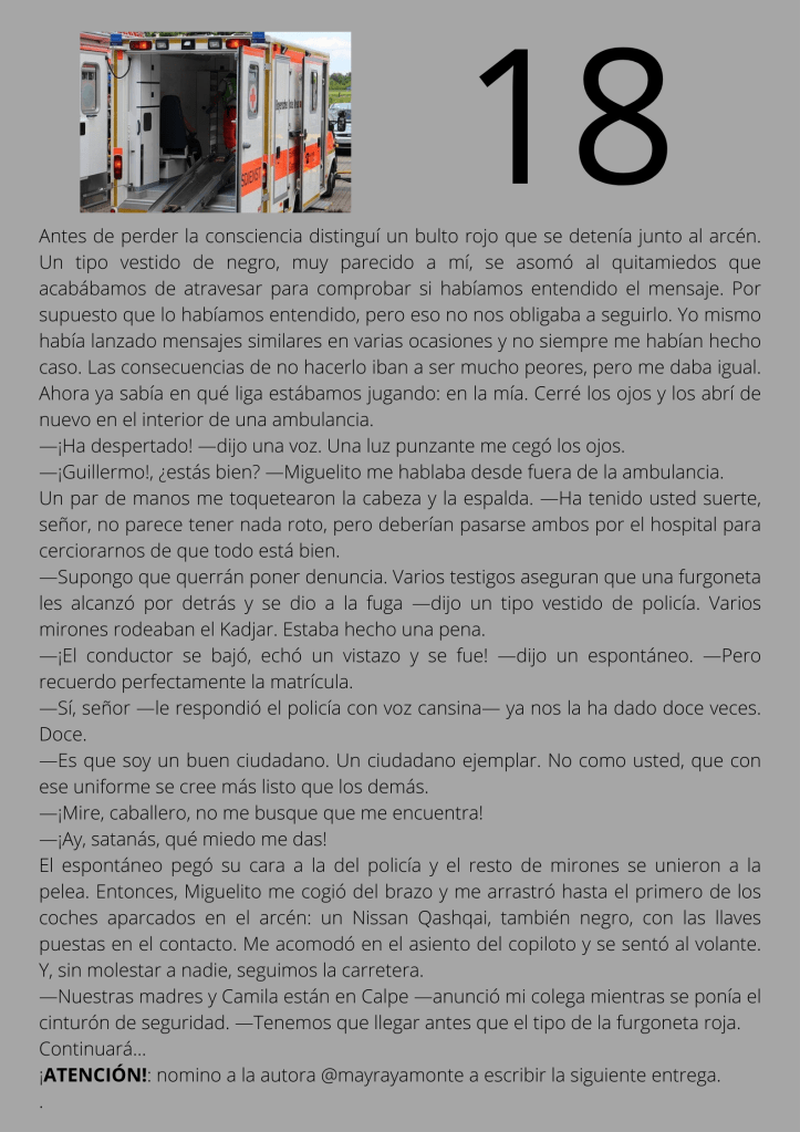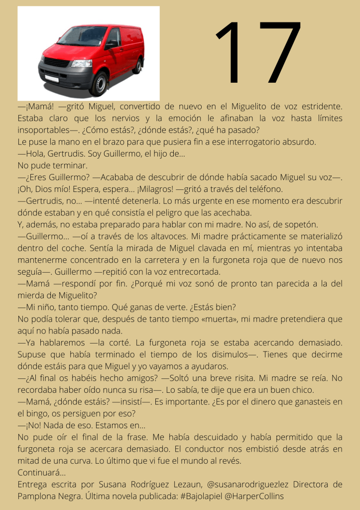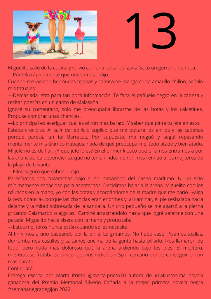 Durante el mes de agosto escribí un relato por entregas que subía diariamente a mis redes sociales. A partir del día trece del mes, otros autores y autoras de novela negra, a los que yo misma iba nominando, comenzaron a participar en el proyecto. De este modo, y desde esa fecha, las entregas de los días impares corresponden a escritores y escritoras que no son yo misma pero que, atendiendo a su pluma, en ocasiones me gustaría serlo.