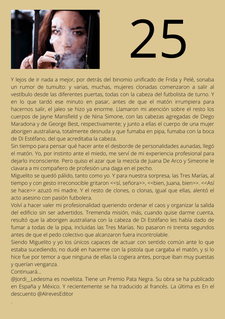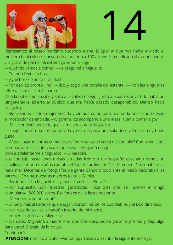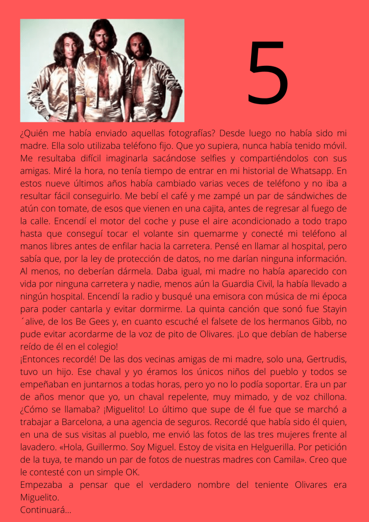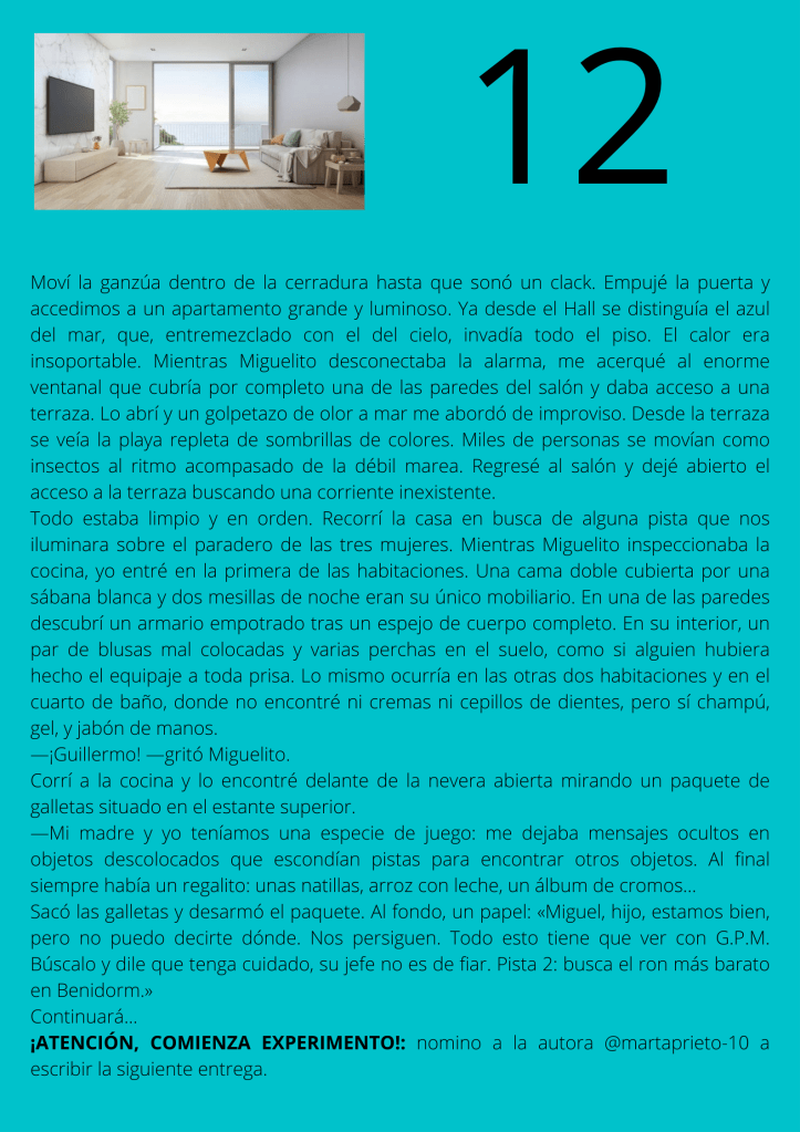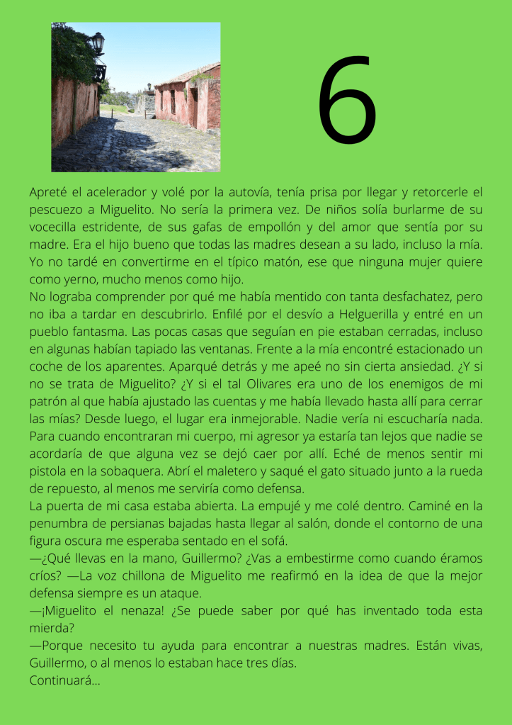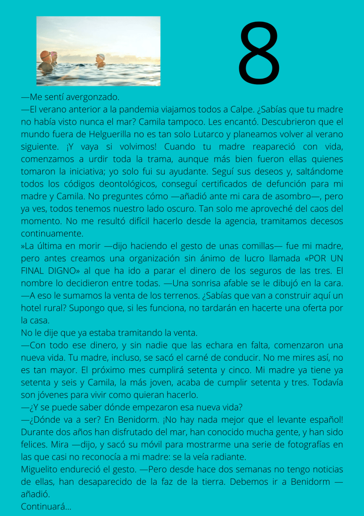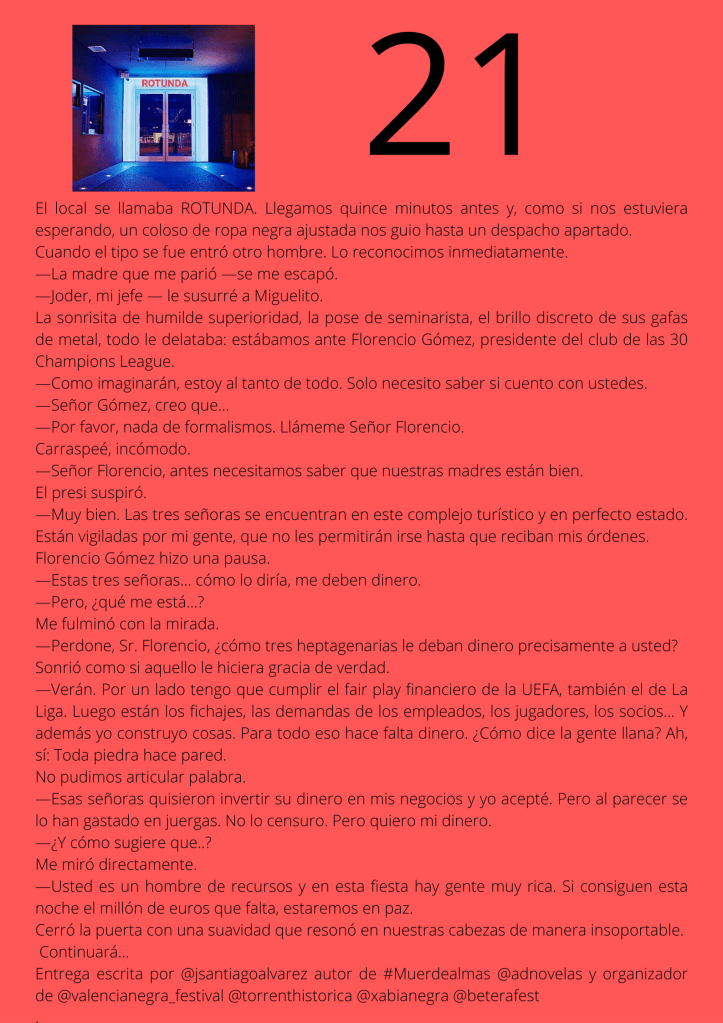 Durante el mes de agosto escribí un relato por entregas que subía diariamente a mis redes sociales. A partir del día trece del mes, otros autores y autoras de novela negra, a los que yo misma iba nominando, comenzaron a participar en el proyecto. De este modo, y desde esa fecha, las entregas de los días impares corresponden a escritores y escritoras que no son yo misma pero que, atendiendo a su pluma, en ocasiones me gustaría serlo.