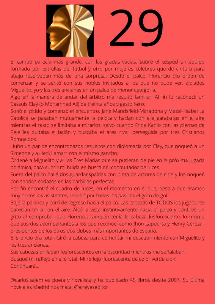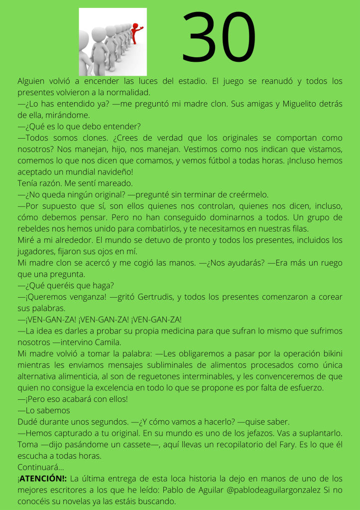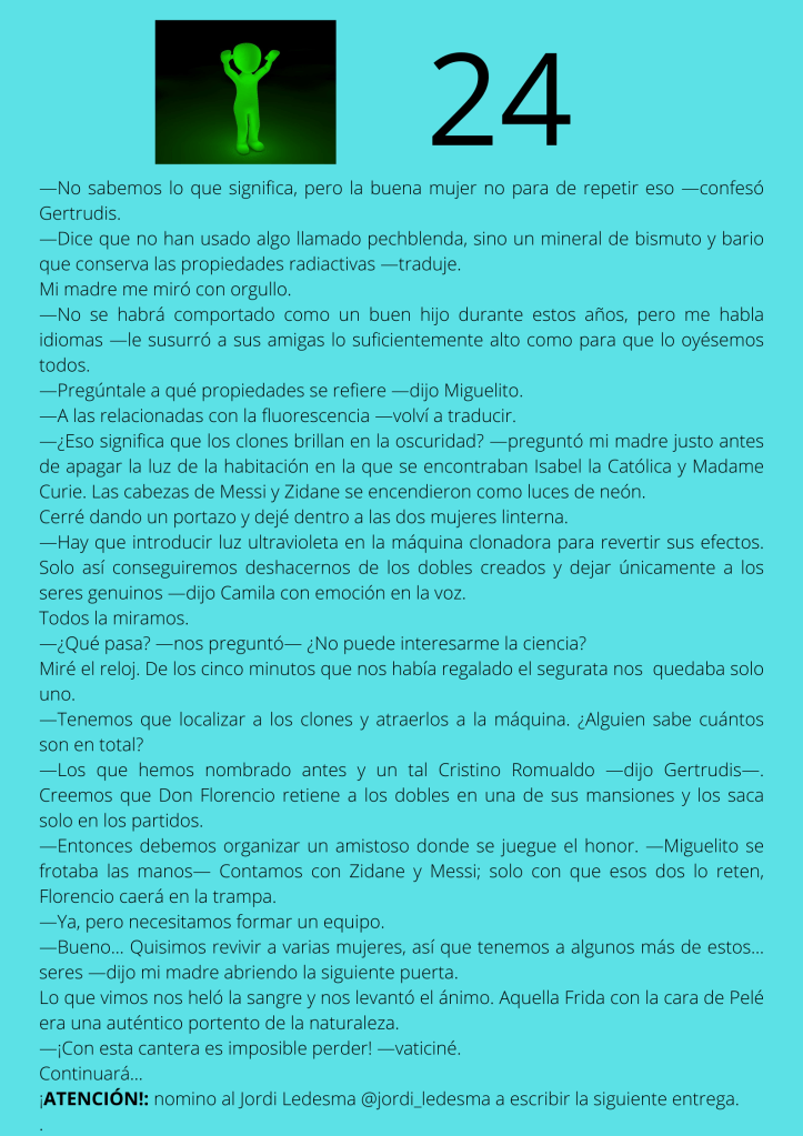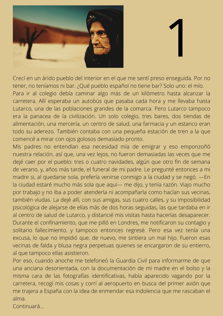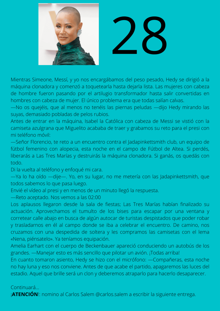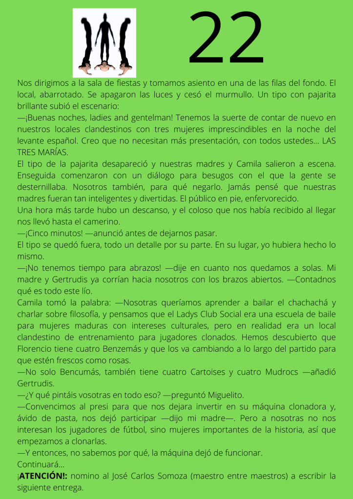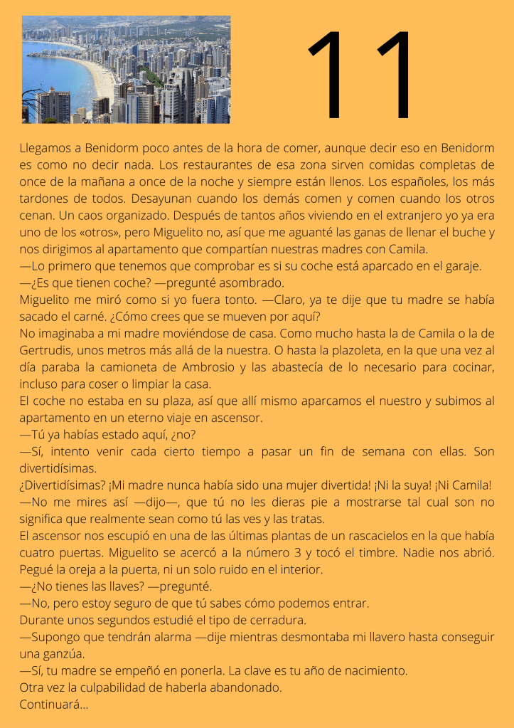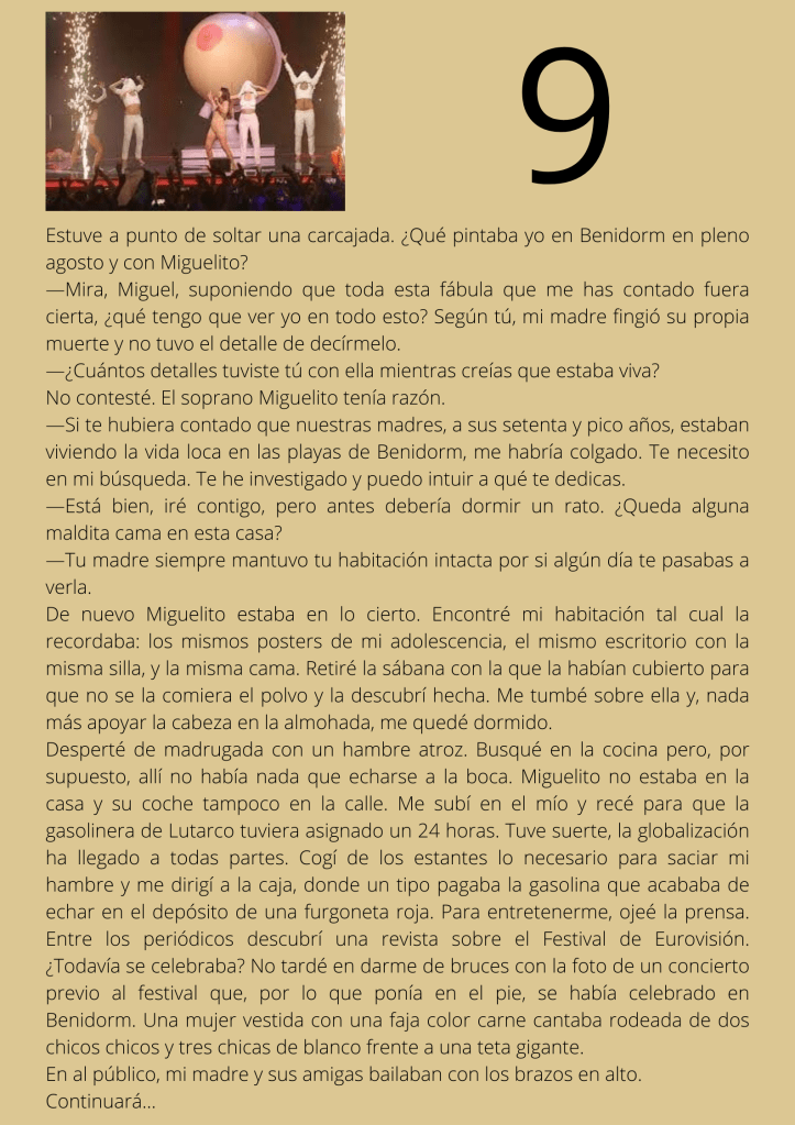 Durante el mes de agosto escribí un relato por entregas que subía diariamente a mis redes sociales. A partir del día trece del mes, otros autores y autoras de novela negra, a los que yo misma iba nominando, comenzaron a participar en el proyecto. De este modo, y desde esa fecha, las entregas de los días impares corresponden a escritores y escritoras que no son yo misma pero que, atendiendo a su pluma, en ocasiones me gustaría serlo.